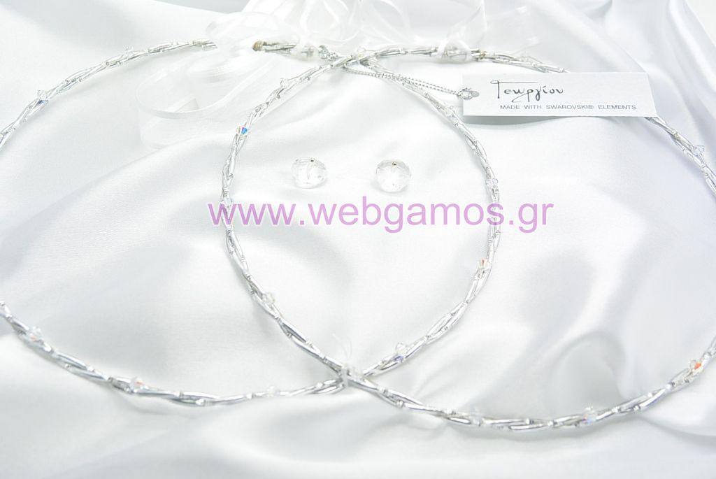 Στέφανα Γάμου επάργυρα και crystal swarovski με σύρμα. Η τιμή αφορά τα στέφανα, την στεφανοθήκη και 2 μπουτουνιέρες.