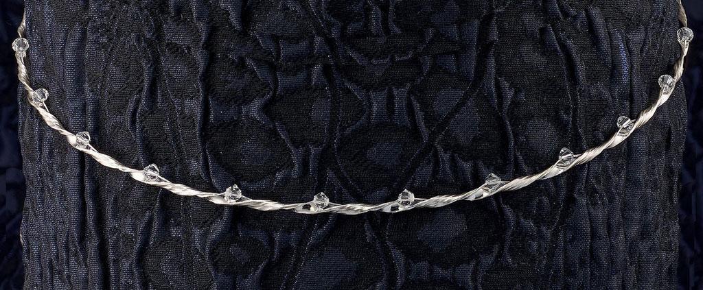 Στέφανα Γάμου επάργυρα με βέργα στριφτή με αμμοβολή και κρυσταλλάκια Swarovski. Η τιμή αφορά τα στέφανα, την στεφανοθήκη και 2 μπουτουνιέρες.