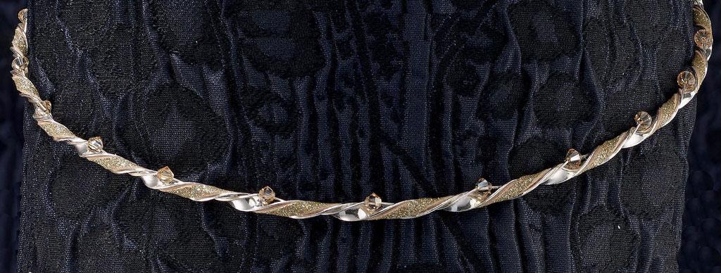 Στέφανα Γάμου επάργυρα με βέργα στριφτή, χρυσό δέρμα και ιβουάρ κρυσταλλάκια Swarovski. Η τιμή αφορά τα στέφανα, την στεφανοθήκη και 2 μπουτουνιέρες.