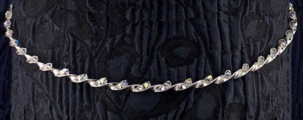 Στέφανα Γάμου επάργυρα με βέργα στριφτή και ιριζέ κρυσταλλάκια Swarovski. Η τιμή αφορά τα στέφανα, την στεφανοθήκη και 2 μπουτουνιέρες.