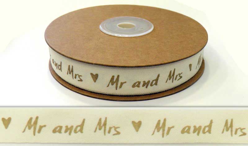 Κορδέλα Βαμβακερή με τύπωμα Mr & Mrs και διάσταση 1.5 εκ x 18.5 μέτρα.