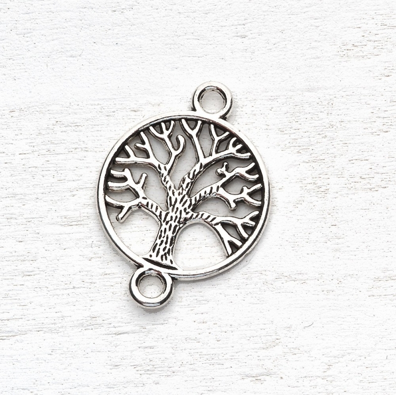 Μεταλλικό κρεμαστό διακοσμητικό στρογγυλό δέντρο σε χρώμα ασημί με 2 τρύπες. Κατάλληλο για διακοσμήσεις και χειροποίητες κατασκευές. Η συσκευασία περιέχει 10 τεμάχια.
