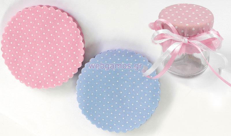 Πανάκι Πουά βαμβακερό σε δυο αποχρώσεις και διάσταση 9,5 εκ για στολισμό σε βαζάκια με γλυκό. Συσκευασία 100 τεμαχίων.