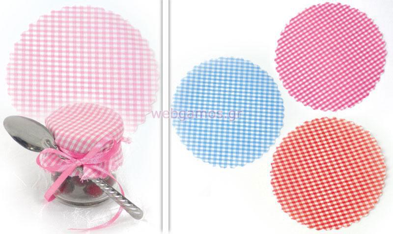 Πανάκι Καρό σε διάφορες αποχρώσεις και διάσταση 9,5 εκ για στολισμό σε βαζάκια με γλυκό. Συσκευασία 100 τεμαχίων.
