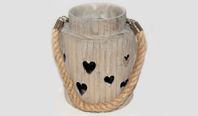 Στρογγυλό Κηροπήγειο με σχέδιο καρδιές, εσωτερική γυάλα και χερούλι απο σχοινί σε γκρι αντικέ απόχρωση. Διάσταση 11x16cm.
