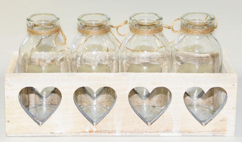 Ξύλινη Μακρόστενη βάση με σχέδιο καρδιά και 4 μπουκαλάκια σε λευκή αντικέ απόχρωση. Διάσταση βάσης 21.5x6.5x6cm και διάσταση μπουκαλιού 3x10.5cm.