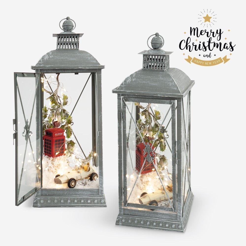 Χριστουγεννιάτικο γκρι μεταλλικό φανάρι με φωτάκια led. Μέσα περιλαμβάνει vintage πολυεστερικό κόκκινο κουμπαρά τηλεφωνικό θάλαμο και μεταλλική φόρμουλα. Είναι στολισμένο με διακοσμητικό χιόνι και φύλλα γκι. Τα φωτάκια λειτουργούν με μπαταρίες (3 τεμάχια ΑΑ).
