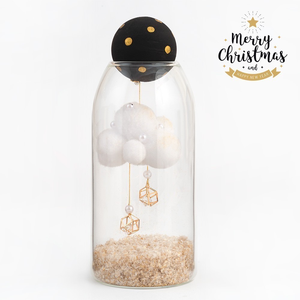 Χριστουγεννιάτικο ψηλό γυάλινο διακοσμητικό με καπάκι-μπάλα από φελλό σε μαύρο χρώμα με χρυσά πουά. Από το καπάκι κρέμονται pop poms με πέρλες και κοσμήματα με διαμαντάκι εσωτερικά. Στο κάτω μέρος υπάρχει διακοσμητικό χιόνι με glitter χρυσό.