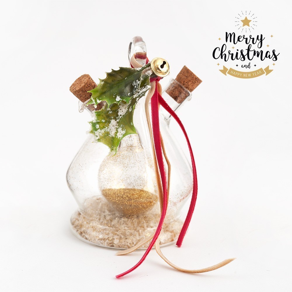 Χριστουγεννιάτικο γυάλινο χαμηλό μπουκάλι διπλής ανάμιξης με διακοσμητικό χιόνι και glitter χρυσό. Είναι στολισμένο με κορδέλες, κουδουνάκι και φύλλα γκι.