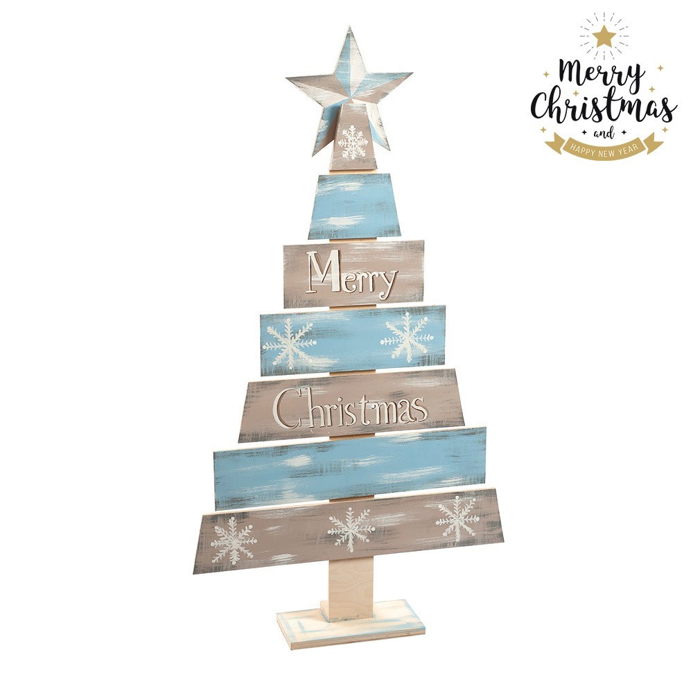 Ξύλινο διακοσμητικό δέντρο Χριστουγέννων σε σιέλ και γκρι αποχρώσεις. Μπροστά είναι ζωγραφισμένες λευκές χιονονιφάδες και η φράση ''Merry Christmas''.