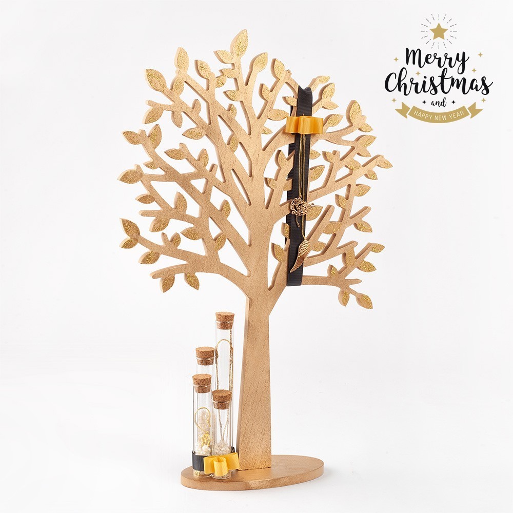 Ξύλινο διακοσμητικό δέντρο με φύλλα σε χρυσό χρώμα. Είναι διακοσμημένο με 4 γυάλινους δοκιμαστικούς σωλήνες που περιέχουν πέρλες, κρεμαστό μεταλλικό κλειδί και διακοσμητικό χιόνι. Είναι στολισμένο με κορδέλα και κρεμαστά μεταλλικά μοτίφ δέντρο-φτερό σε χρυσό χρώμα.