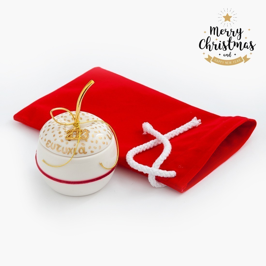 Χριστουγεννιάτικο γούρι πορσελάνινη λευκή μπιζουτιέρα σε σχήμα μήλου. Είναι ζωγραφιστή με την φράση Υγεία, αγάπη, ευτυχία με χρυσά πουά, διακοσμημένο με μεταλλικό στοιχείο και κορδέλες. Συνοδεύεται από κόκκινο βελούδινο πουγκί.