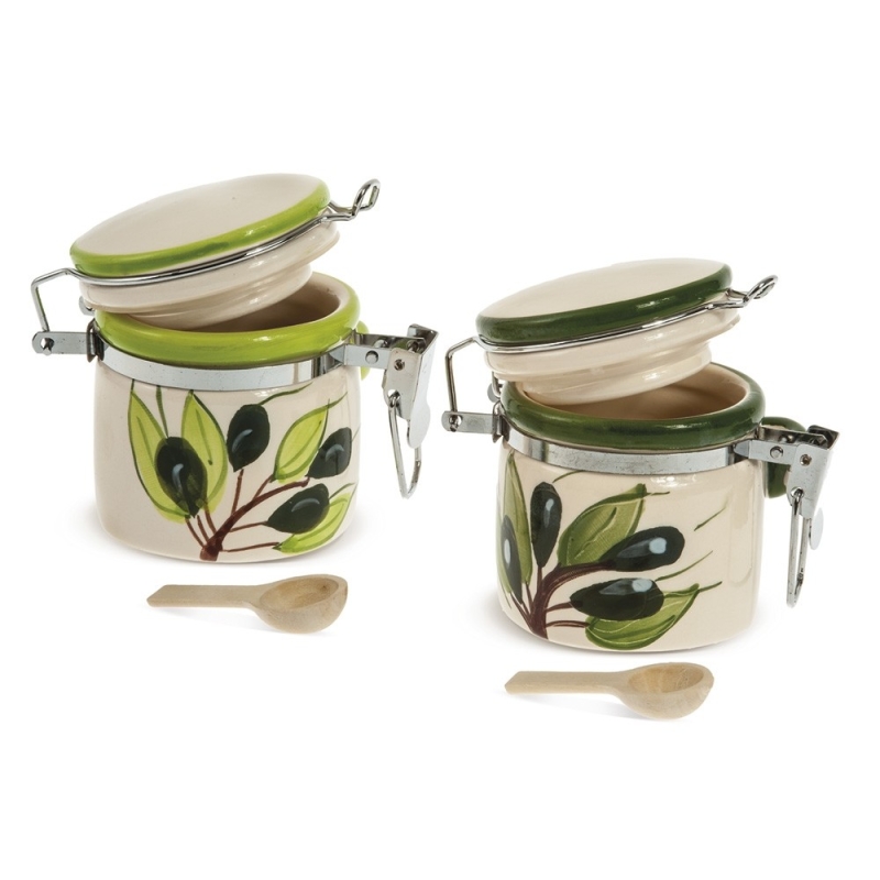 Κεραμικό βαζάκι με σχέδιο κλαδί ελιά και καπάκι ασφαλείας σε αποχρώσεις εκρού, πράσινου.Έχει ειδική θήκη στο χερούλι που μπαίνει το κουτάλι. Ο κωδικός περιλαμβάνει 2 σχέδια.