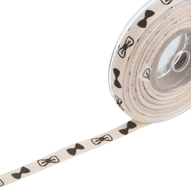 Κορδέλα ψαροκόκαλο 25mm x 9,1m. Print με παραστάσεις παπιγιόν σε μαύρο χρώμα πάνω σε εκρού βάση.