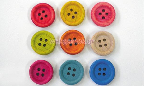 Διακοσμητικό Ξύλινο κουμπί με διαστάσεις 1,5 εκ σε διάφορες αποχρώσεις. Ελάχιστη παραγγελία 100 τεμάχια.
