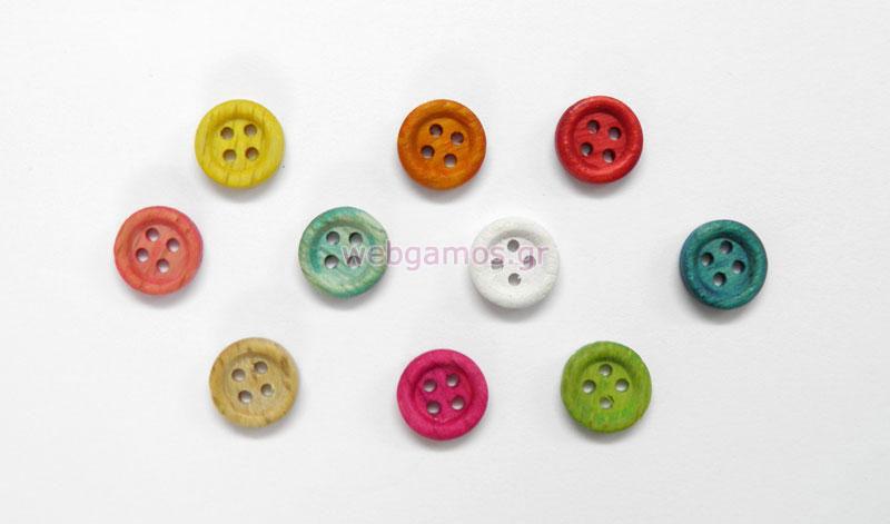 Διακοσμητικό Ξύλινο κουμπί με διαστάσεις 1,1 εκ σε διάφορες αποχρώσεις. Ελάχιστη παραγγελία 100 τεμάχια.