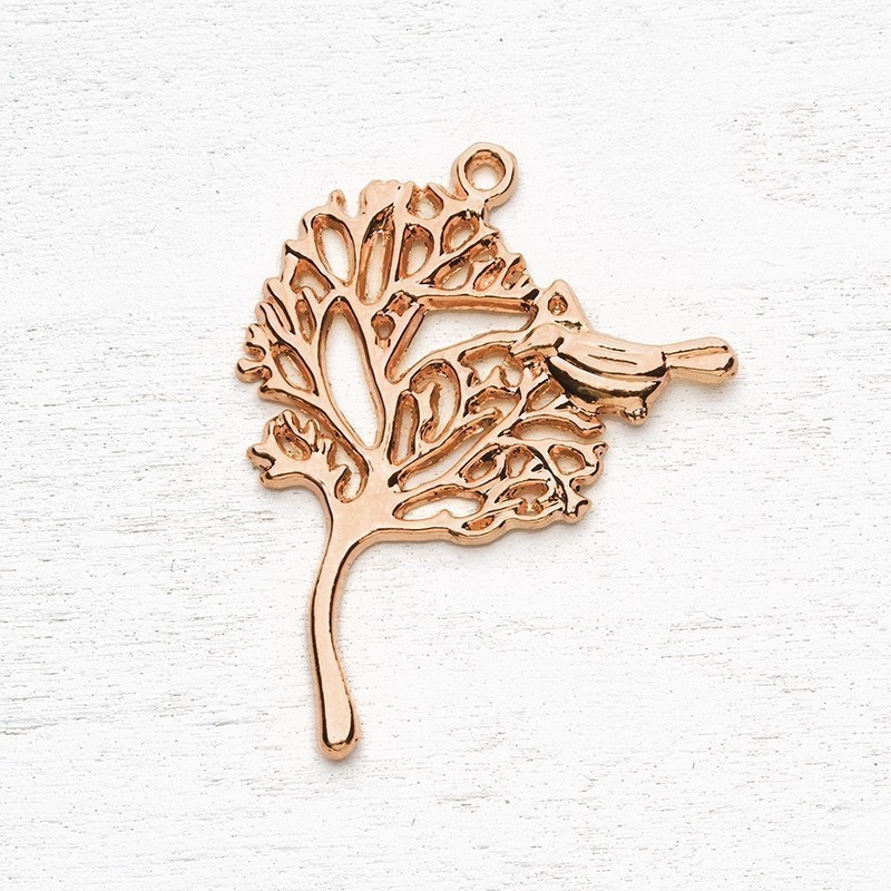 Μεταλλικό κρεμαστό διακοσμητικό δέντρο με πουλί σε χρώμα rose gold. Κατάλληλο για διακοσμήσεις και χειροποίητες κατασκευές. Η συσκευασία περιέχει 10 τεμάχια.