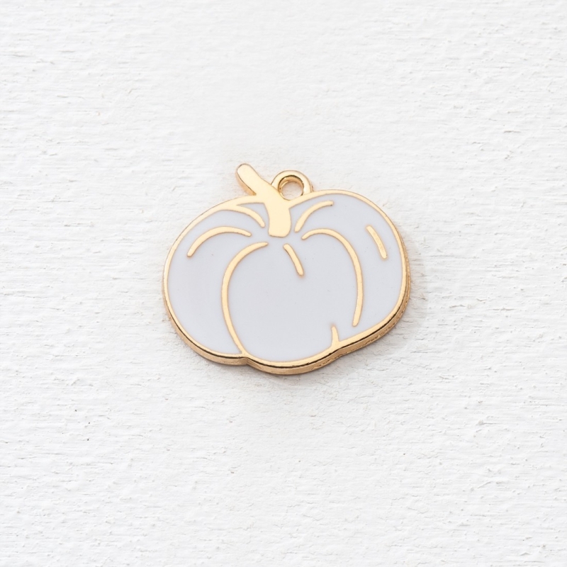 Μεταλλική κρεμαστή διακοσμητική κολοκύθα σε χρυσό χρώμα με σμάλτο λευκό. Κατάλληλο για διακοσμήσεις και χειροποίητες κατασκευές. Η συσκευασία περιέχει 10 τεμάχια.