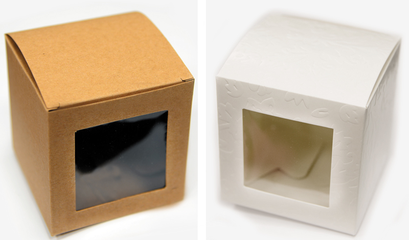 Κουτί χάρτινο μεγάλο με παράθυρο ζελατίνα με συνολική διάσταση 10 cm και το παράθυρο 6cm x 6cm.