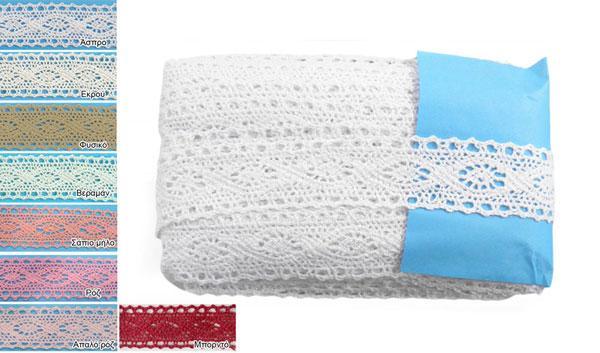 Δαντέλα Βαμβακερή σε 5 αποχρώσεις. Διάσταση 3.5 εκ x 20 μέτρα.