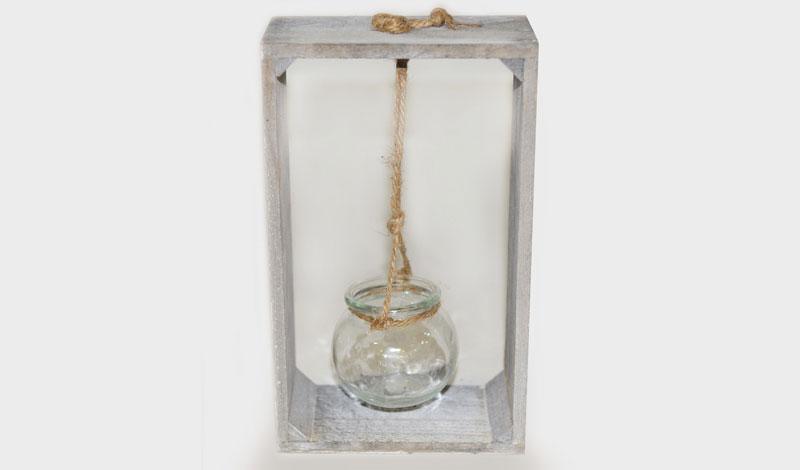 Ξύλινη Βάση με γυάλινο κηροπήγειο ρεσώ εκκρεμές σε γκρι αντικέ απόχρωση. Διάσταση 15x7.5x25cm .