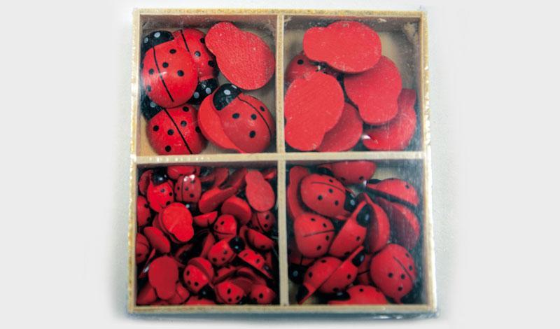 Ξύλινο Κουτί με 77 κόκκινες πασχαλίτσες. Το κουτί περιλαμβάνει 3 μεγέθη 50 τεμάχια με διάσταση 1.3 εκ, 15 τεμάχια με διάσταση 1.9 εκ και 12 τεμάχια με διάσταση 2.4 εκ.