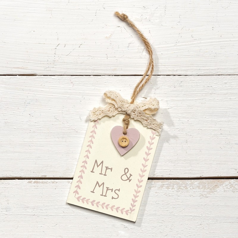 Ξύλινη κρεμαστή διακοσμητική ταμπελίτσα σε εκρού αποχρώσεις με natural σπάγγο και κουμπί. Τυπωμένη με λογότυπο Mr & Mrs. Ιδανικό και για γάμο.