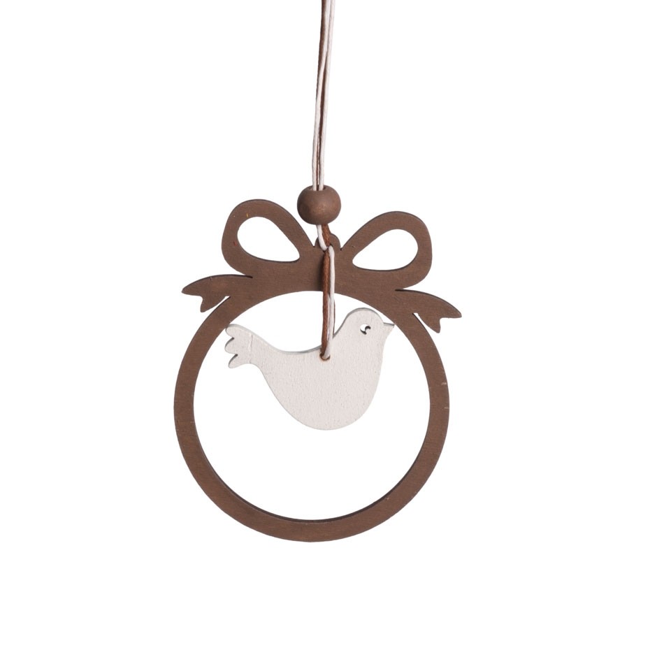 Ξύλινη διακοσμητικό σε λευκή απόχρωση. Κρεμαστή μέσα σε στρογγυλό καφέ πλαίσιο σε σχήμα δώρου.