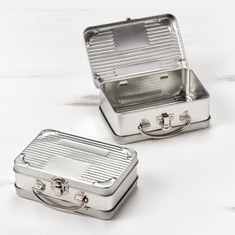 Μεταλλικό βαλιτσάκι σε ασημί χρώμα.
