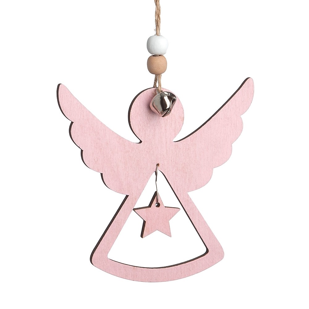 Ξύλινο κρεμαστό αγγελάκι σε ροζ χρώμα, διακοσμημένο με χάντρες και μεταλλικό κουδουνάκι. Ιδανικό για διακόσμηση.