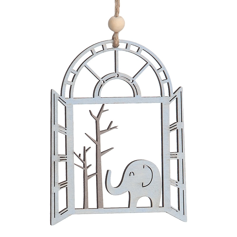 Ξύλινο κρεμαστό διακοσμητικό παράθυρο με ελέφαντα σε χρώμα γκρι. Διακοσμημένο με ξύλινη χάντρα.