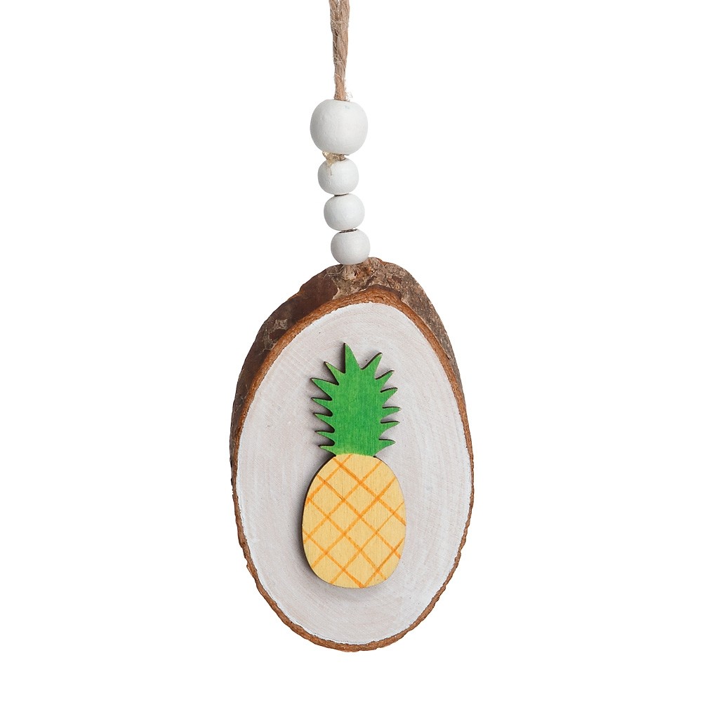 Ξύλινος κρεμαστός διακοσμητικός φυσικός κορμός σε natural χρώμα με ανανά σε κίτρινο-πράσινο χρώμα. Διακοσμημένος με λευκές ξύλινες χάντρες.