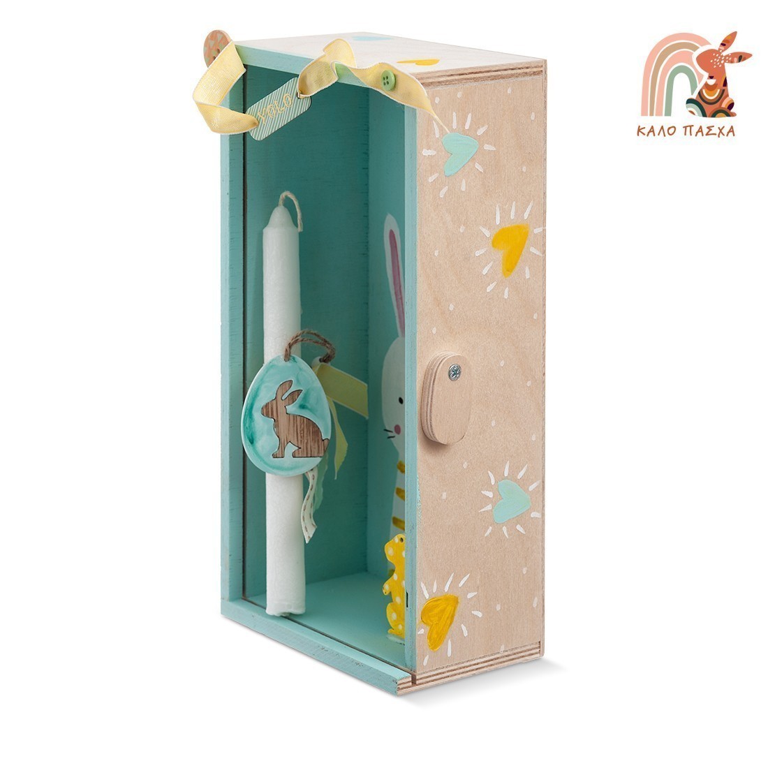 Πασχαλινό σετ δώρου με θέμα easter is fun. Το πασχαλινό δωράκι περιλαμβάνει: 1) το ξύλινο κουτί με plexiglass ζωγραφισμένο με λαγουδάκι σε βεραμάν φόντο 2) τη λαμπάδα η οποία είναι διακοσμημένη με ξύλινο διακοσμητικό λαγουδάκι σε σχήμα αυγού