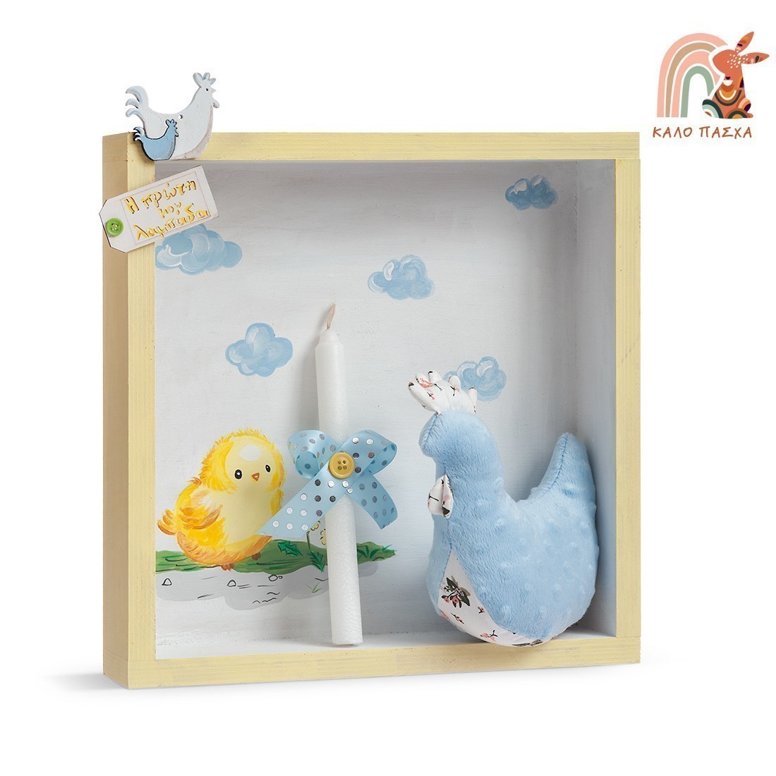 Ξύλινη πασχαλινή κορνίζα σετ δώρου με θέμα Η μικρή φάρμα με την σιέλ κοτούλα. Στο σετ περιλαμβάνεται η πασχαλινή λαμπάδα