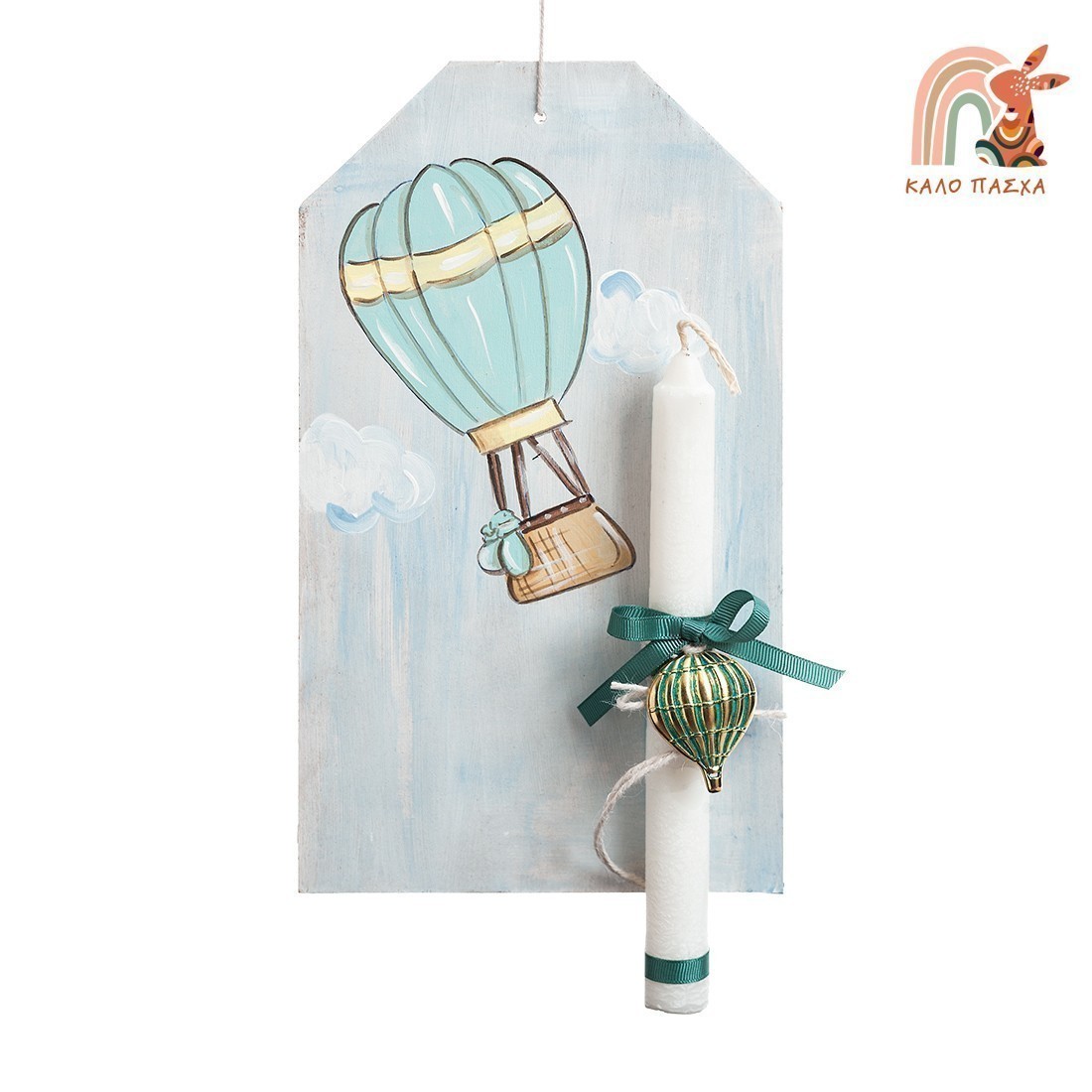 Πασχαλινή λαμπάδα με θέμα το αερόστατο. Το πασχαλινό δωράκι περιλαμβάνει: 1) την ξύλινη κρεμαστή ετικέτα ζωγραφισμένη με αερόστατο 2) τη λαμπάδα η οποία είναι διακοσμημένη με γκρο πράσινη κορδέλα και μεταλλικό μοτίφ αερόστατο