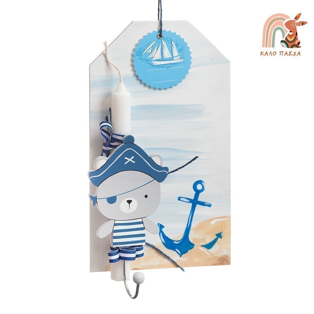 Πασχαλινή λαμπάδα με θέμα το αρκουδάκι πειρατής. Το πασχαλινό δωράκι περιλαμβάνει: 1) την ξύλινη κρεμαστή ετικέτα ζωγραφισμένη με τον βυθό της θάλασσας 2) τη λαμπάδα η οποία είναι διακοσμημένη με κορδέλα γκρο μπλε navy και ξύλινη κρεμάστρα αρκουδάκι πειρατή 3)χάρτινη ετικέτα σιέλ καράβι