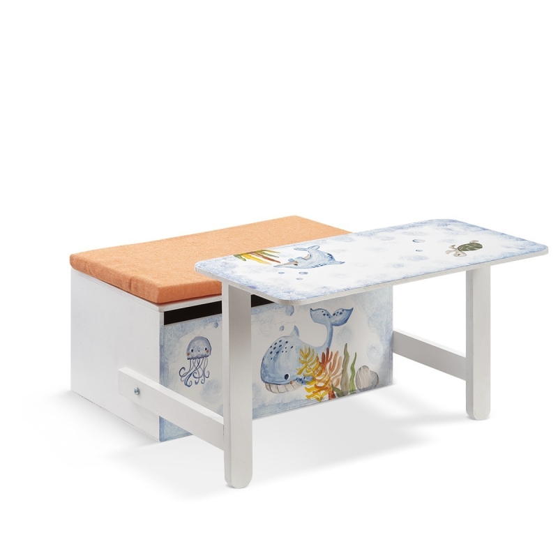 "My sea friends".Ξύλινο κουτί βαπτιστικών παγκάκι που γίνεται θρανίο. Το κουτί έχει σβησίματα σε μπλε αποχρώσεις ώστε να δημιουργείται η αίσθηση του βυθού και ζωγραφισμένα διάφορα θαλάσσια ζωάκια. Το μαξιλάρι του θρανίου είναι ντυμένο σε πορτοκαλί χρώμα.