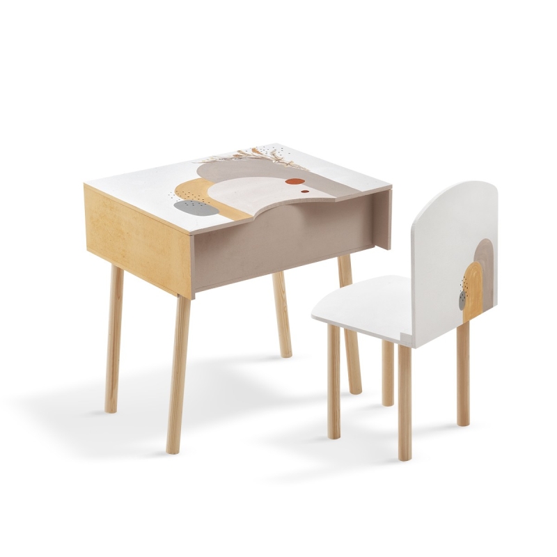 "Μοντέρνα γεωμετρία". Ξύλινη συσκευασία βάπτισης-γραφείο με καρεκλάκι. Το σετ είναι ζωγραφισμένο σε γηϊνές αποχρώσεις με αφαιρετικά-αφηρημένα σχέδια.