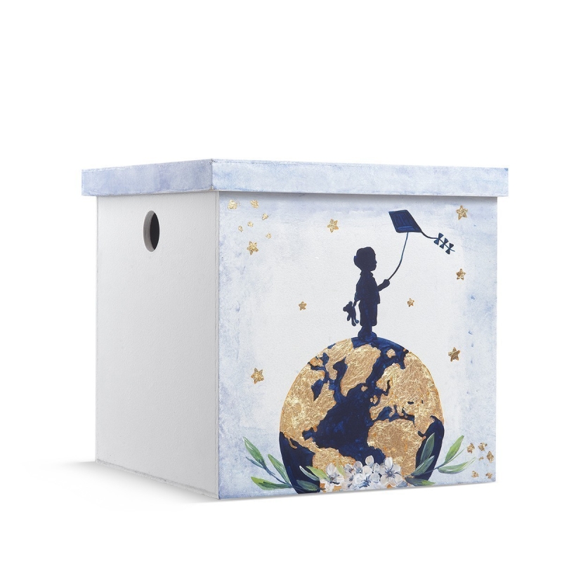 "hello world, hello little boy" Ξύλινη συσκευασία βάπτισης σχήματος κύβου σε brush σιέλ απόχρωση. Στο μπροστινό μέρος είναι ζωγραφισμένη η υδρόγειος με χρυσές λεπτομέρειες και η σκιαγράφηση ενός μικρού αγοριού που κρατάει χαρταετό. Στο καπάκι απεικονίζεται το αρχικό του ονόματος του παιδιού σε χρυσό χρώμα. Για τις χρυσοτυπίες έχουν χρησιμοποιηθεί φύλλα χρυσού.