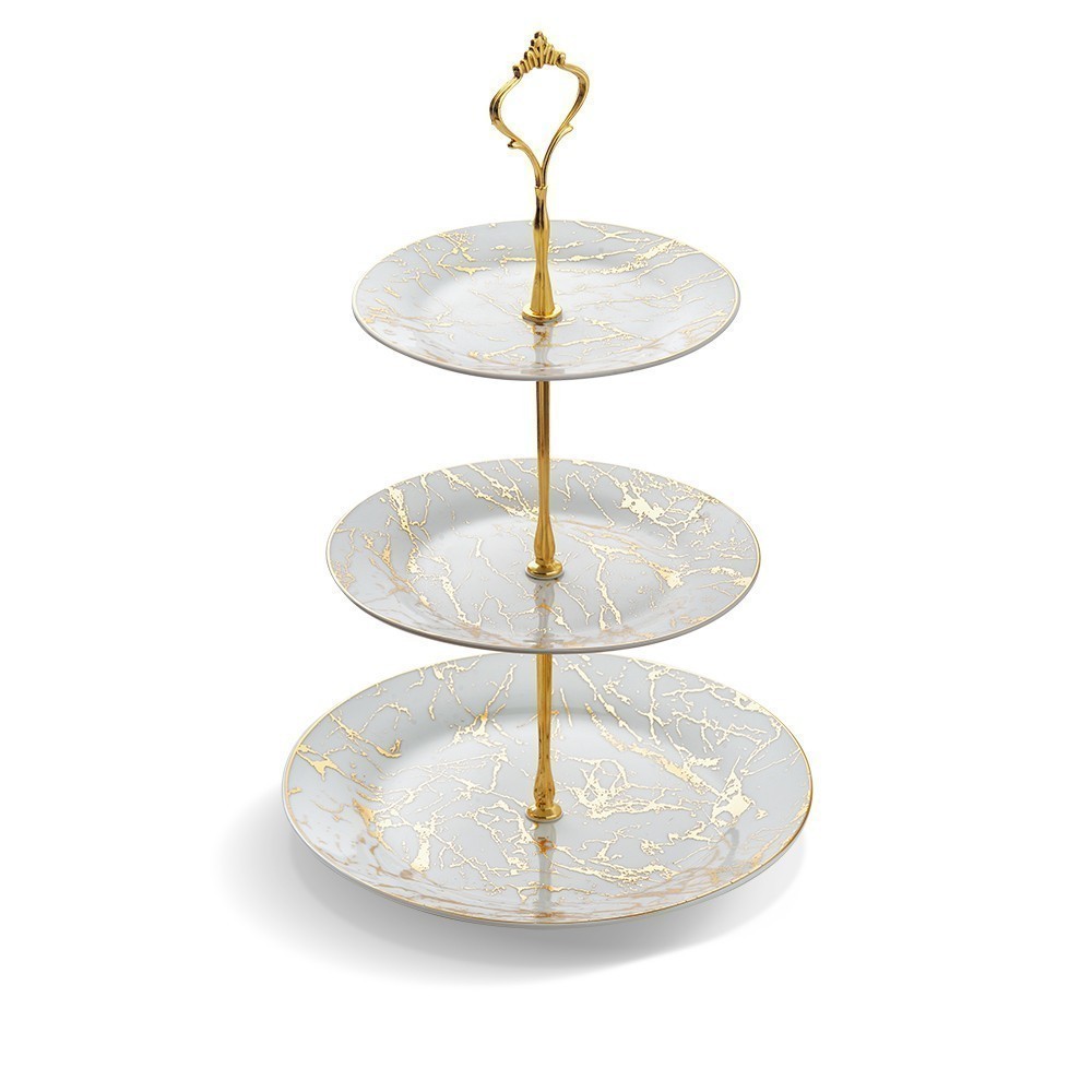 Πορσελάνινη επιτραπέζια τουρτιέρα τριών επιπέδων σε λευκό χρώμα με χρυσές λεπτομέρειες χρυσές λεπτομέρειες που δημιουργούν την αίσθηση μαρμάρου με νερά. Ιδανική παρουσίαση στις εκδηλώσεις σας για τοποθέτηση γλυκών και αλμυρών λιχουδιών.