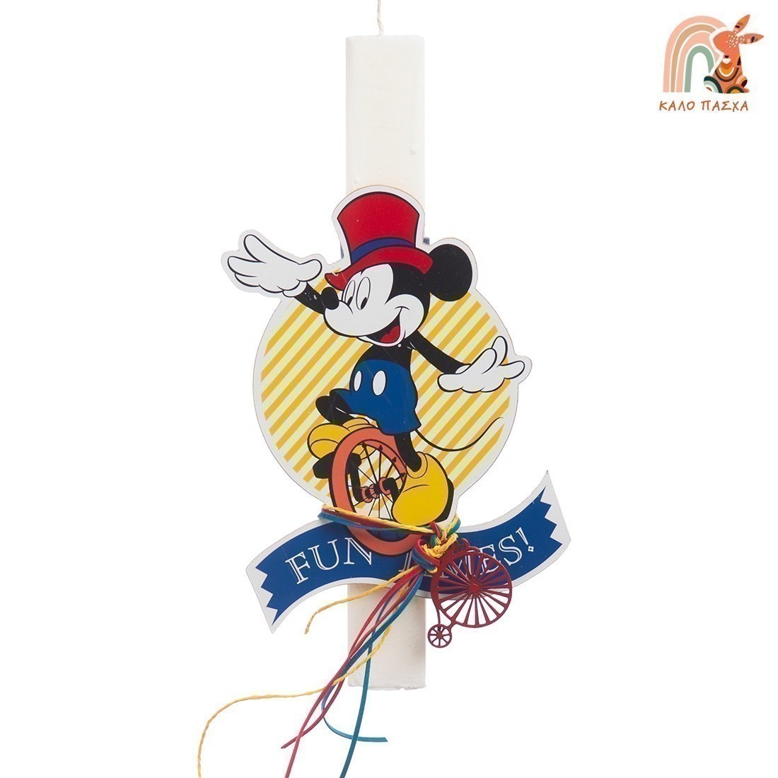Πασχαλινή λαμπάδα με θέμα τον Mickey.Η λαμπάδα είναι διακοσμημένη με ξύλινη παράσταση Mickey Carnival σε κίτρινες-κόκκινες αποχρώσεις.