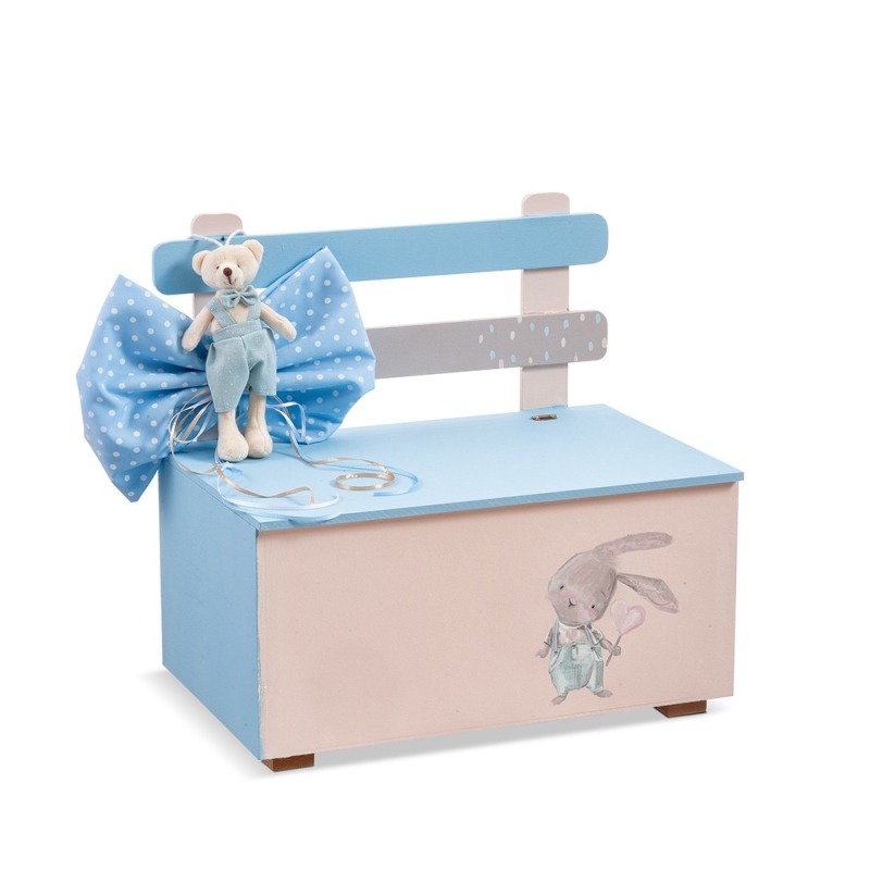 SomeBunny loves you. Ξύλινο κουτί βαπτιστικών παγκάκι. Το κουτί είναι βαμμένο σε σιέλ,σομόν & γκρι αποχρώσεις. Στο μπροστά μέρος είναι ζωγραφισμένο ένα λαγουδάκι. Στο επάνω μέρος είναι διακοσμημένο με πουά σιέλ φιόγκο και λούτρινο αρκουδάκι.