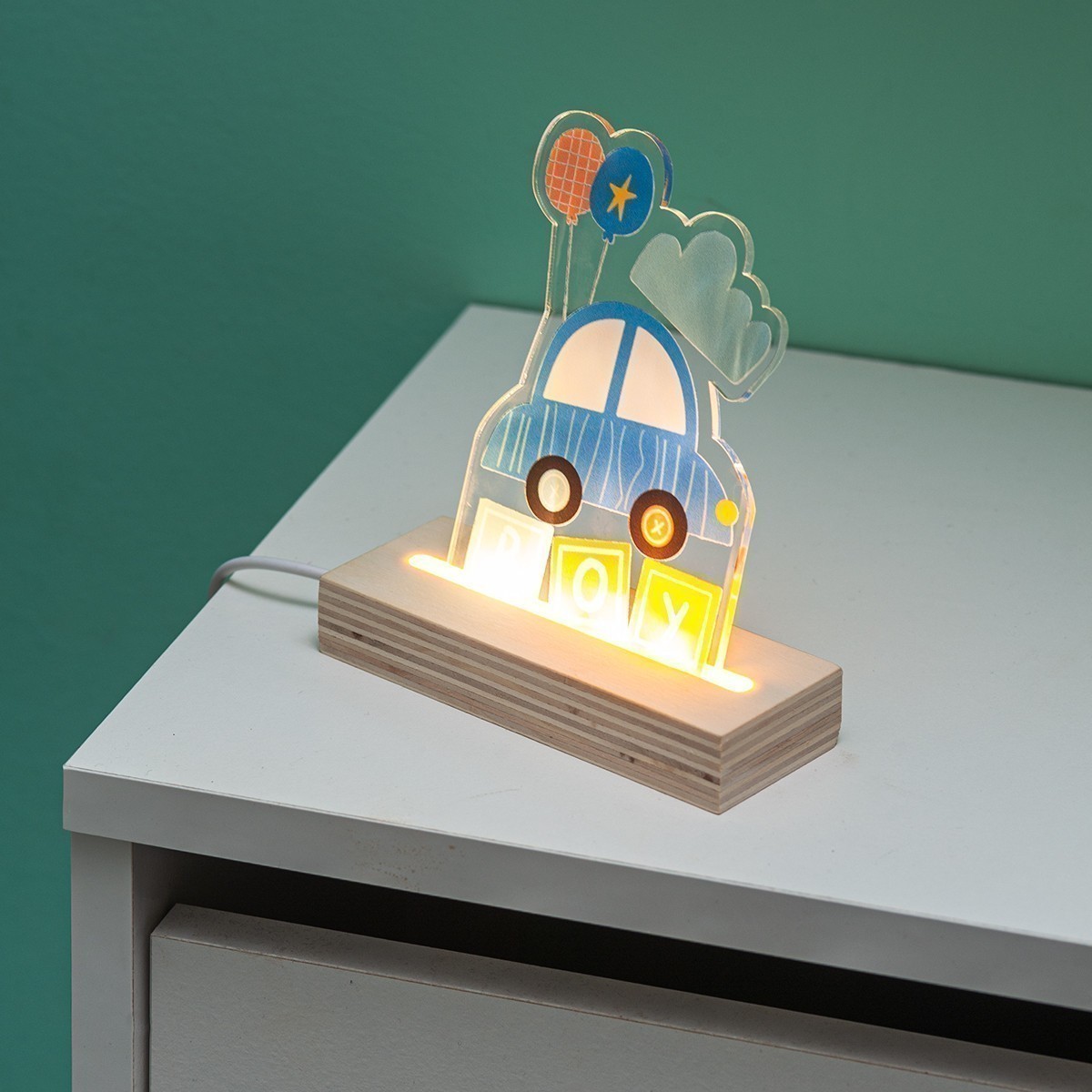 Ξύλινη βάση με Led φωτισμό και καδράκι από διάφανο plexiglass. Η παράσταση απεικονίζει ένα παιδικό αυτοκίνητάκι σε σιέλ αποχρώσεις.