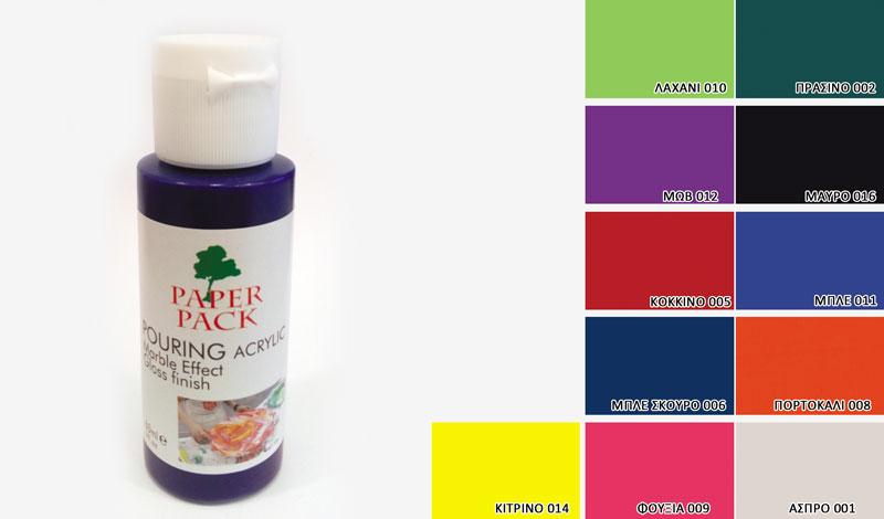Χρώμα Pouring acrylic 60 ml. Ιδανικό για την τεχνική «ρευστή ζωγραφική». Τα χρώματα αυτά δεν αναμειγνύονται κι έτσι δημιουργούνται διάφορα μοτίβα.