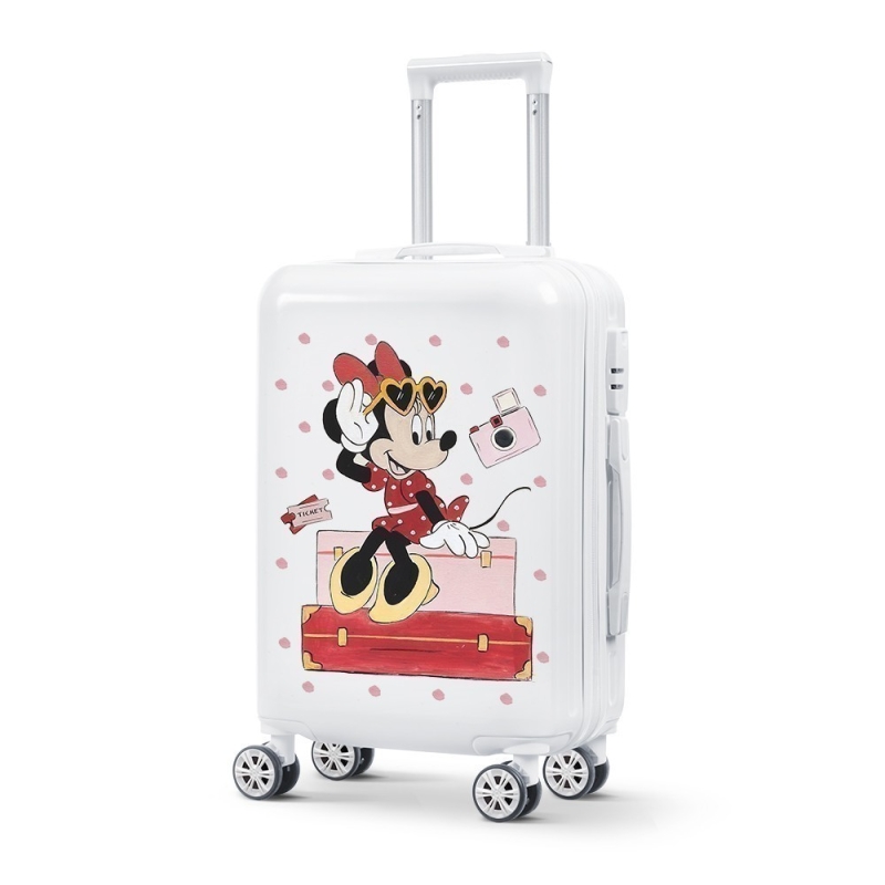 Disney ζωγραφιστή βαλίτσα trolley για βαπτιστικά σε άσπρο γυαλιστερό χρώμα με τη Minnie γελαστή και καθισμένη πάνω στις βαλίτσες της, έτοιμη για ταξίδι και περιτριγυρισμένη με τα απαραίτητα αξεσουάρ και έγγραφα ταξιδιού!