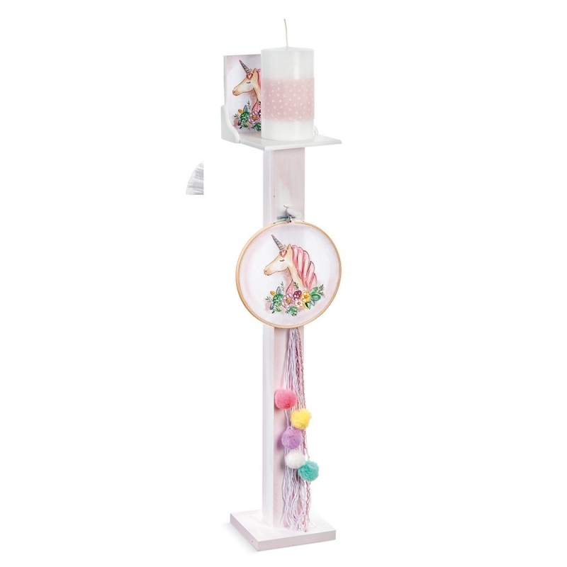 Ξύλινος κηροστάτης-κρεμάστρα,σε χρώμα λευκό με ροζ σβησίματα και διακοσμημένο με ξύλινο τελάρο κεντήματος πάνω στο ύφασμα του οποίου έχει ζωγραφιστεί στο χέρι παράσταση με μονόκερο σε ροζ απόχρωση με πολύχρωμα λουλούδια. Από την κρεμαστρούλα, κρέμονται κορδόνια rayon λευκά-ροζ με πολύχρωμα pompom.