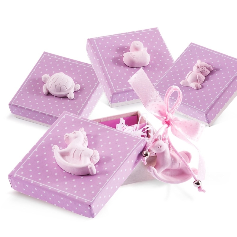 Σετ δώρου σε χάρτινο σιελ πουά κουτάκι. Μέσα περιέχεται ένα κρεμαστό κεραμικό (αλογάκι, ψαράκι, παπάκι, κουκουβάγια). Το ίδιο κεραμικό διακοσμεί και την εξωτερική επιφάνεια του κουτιού.
