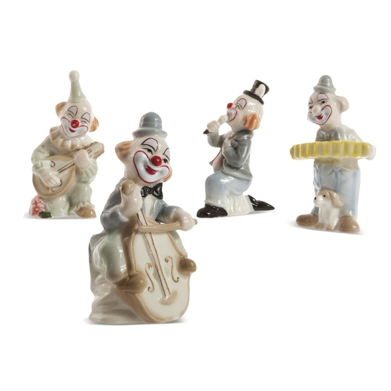 Πορσελάνινος διακοσμητικός κλόουν που παίζει μουσικά όργανα σε αποχρώσεις των σιέλ, βεραμάν και καφέ. Ο κωδικός περιλαμβάνει 4 σχέδια