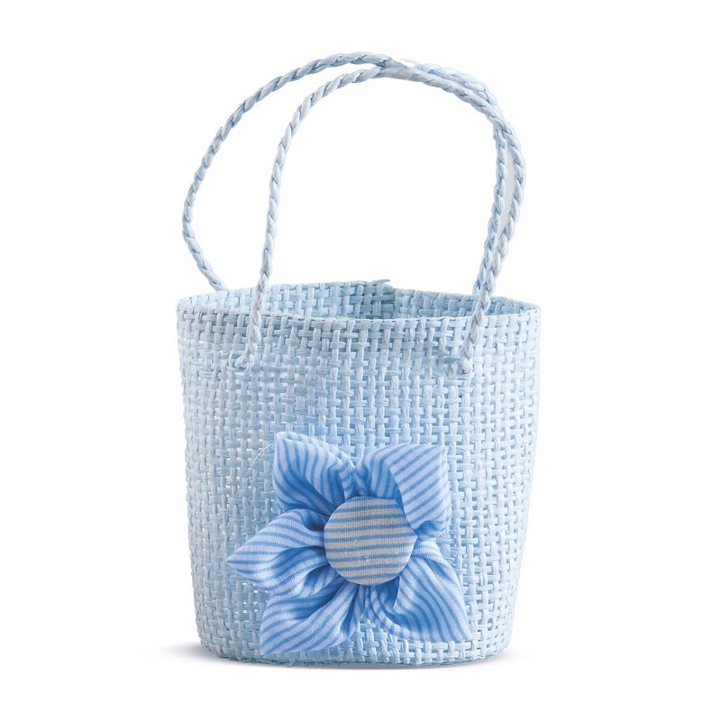 Ψάθινο τσαντάκι το οποίο είναι διακοσμημένο μπροστά με ένα υφασμάτινο λουλούδι.