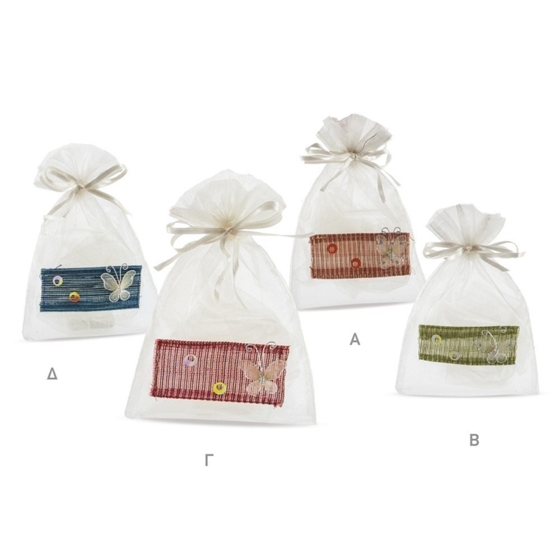 Πουγκί σουρωτό από οργάντζα εκρού με πεταλούδα πάνω σε κομμάτι ύφασμα